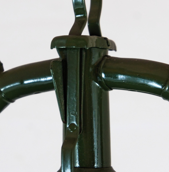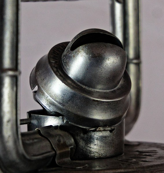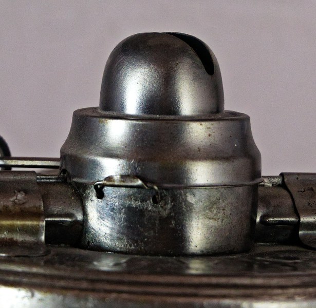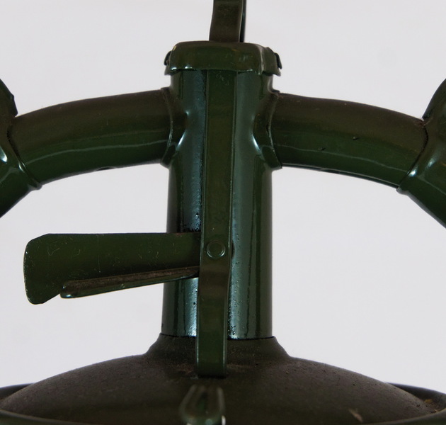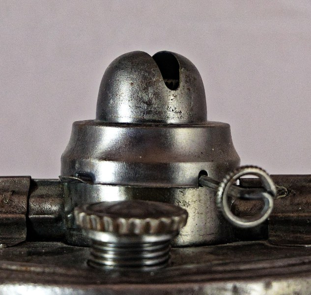Dies geschieht mit Hilfe von einen Draht, der durch eine umgebogene Lasche am Brennerhut gezogen und über zwei Löcher mit der Brennerkammer der Laterne verbunden wird.